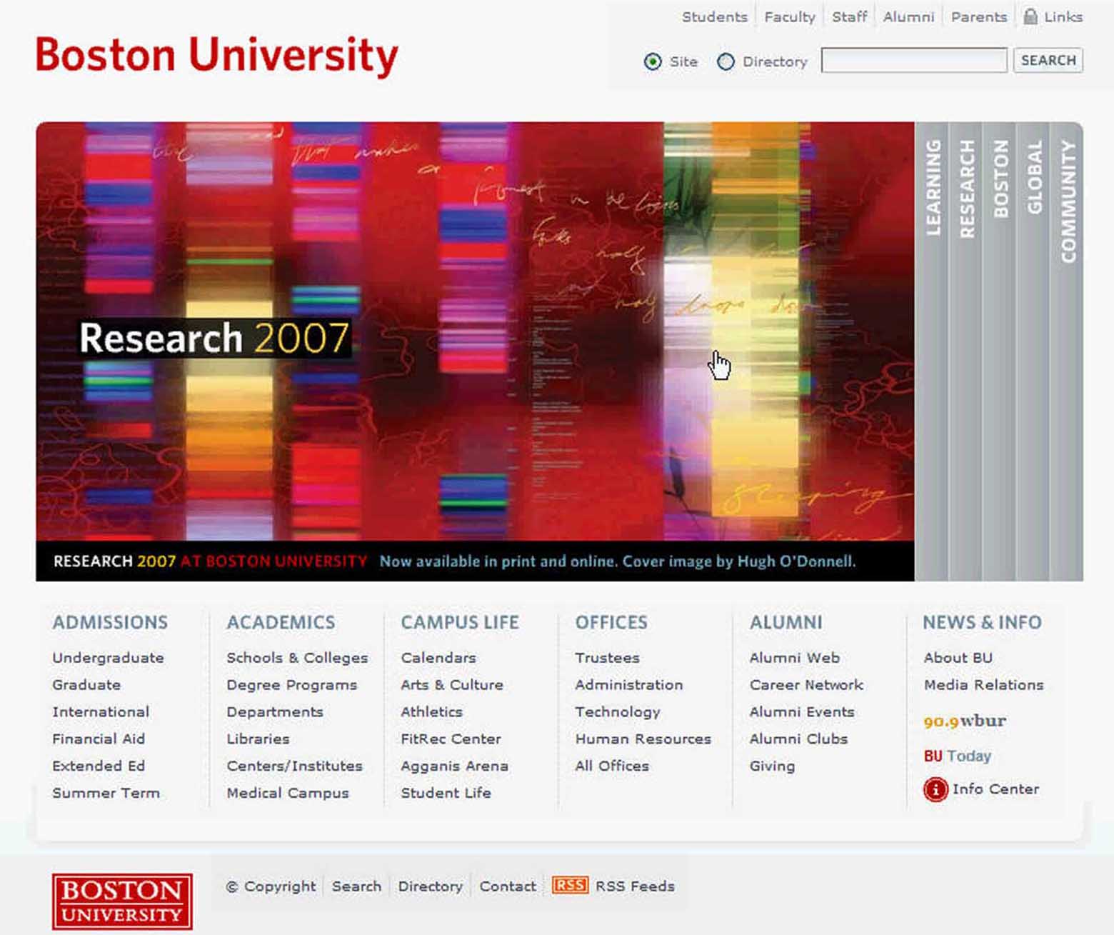 http://www.bu.edu/, Boston University Home Page (shown above): use of image from site-specific commission titled: Seeds of Life, 2006, a front lit digital print on Kodak Endura Paper, 72 x 120 inches (see Special Projects). http://www.bu.edu/research/spotlight/2007/arts/beautifying/index.shtml, Boston University website pages relating to research and Hugh O'Donnell's site-specific program to beautify the Boston Univeristy campus. Artwork by Hugh O'Donnell and site-specific program students is illustrated. As of 2015 the link to this page is no longer accessible. . |
