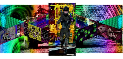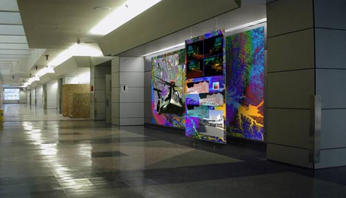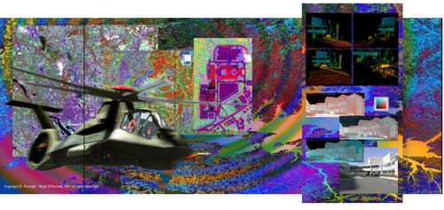 This artwork is a digital collage focusing on remote sensing. I designed an image based on a synthesis of satellite multispectral, airborne hyperspectral and ground based Laser Radar sensors information. Research for this work involved my designing a new color coding scheme for LADAR imaging analysis and commissioning three sensor data sets: