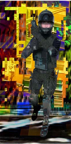 This digital mural is based on new technologies being developed to provide the individual soldier with light-weight power sources, the aim being to give lighter ground based armor that will back up the soldier's ability to survive on contemporary and future battlefields. The central figure of the composition is based on developmental research by the Natick Soldier Center to evolve the 2025 future soldier. Accompanying the central figure are images developed in 2D and 3D software from schematics relating to lithium-ion polymer battery systems and single-walled carbon nanotubes.