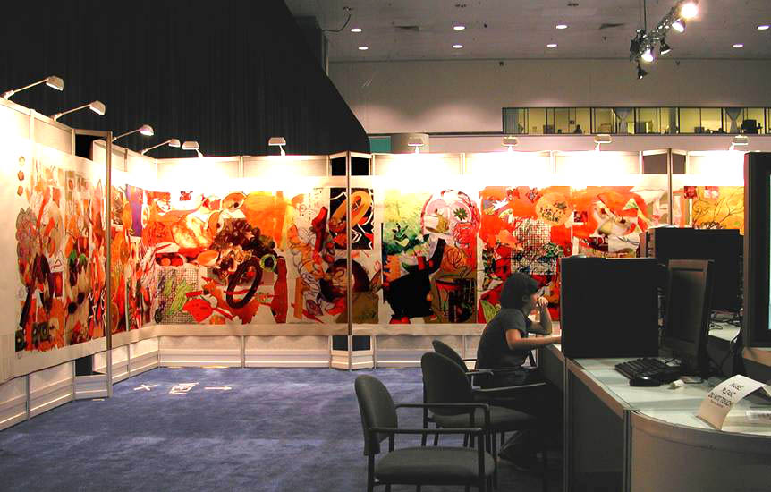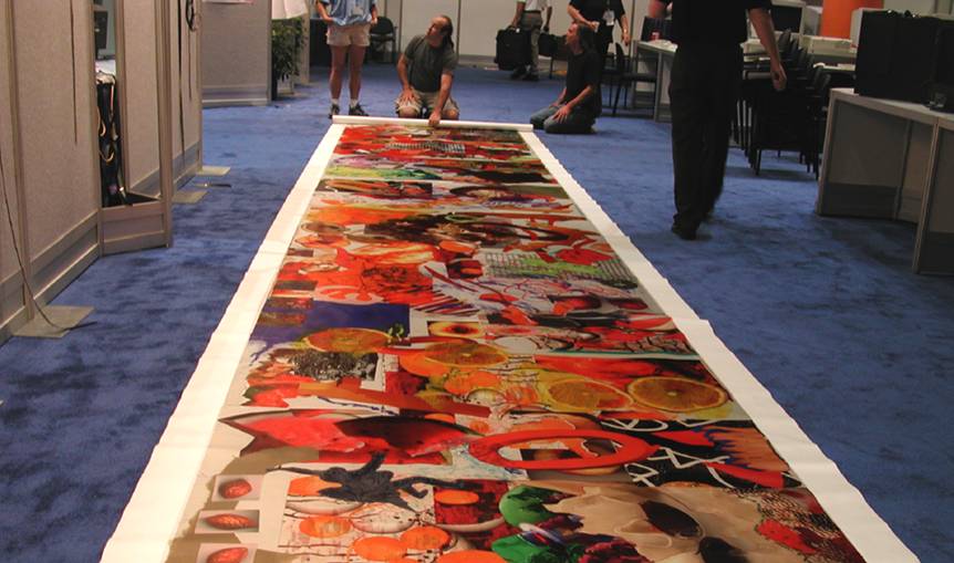 The modules were then rescanned into a computer and laid out as a single image in Adobe Photoshop 72 x 480 inches wide. Jon Cone then printed the new image out onto canvas overnight