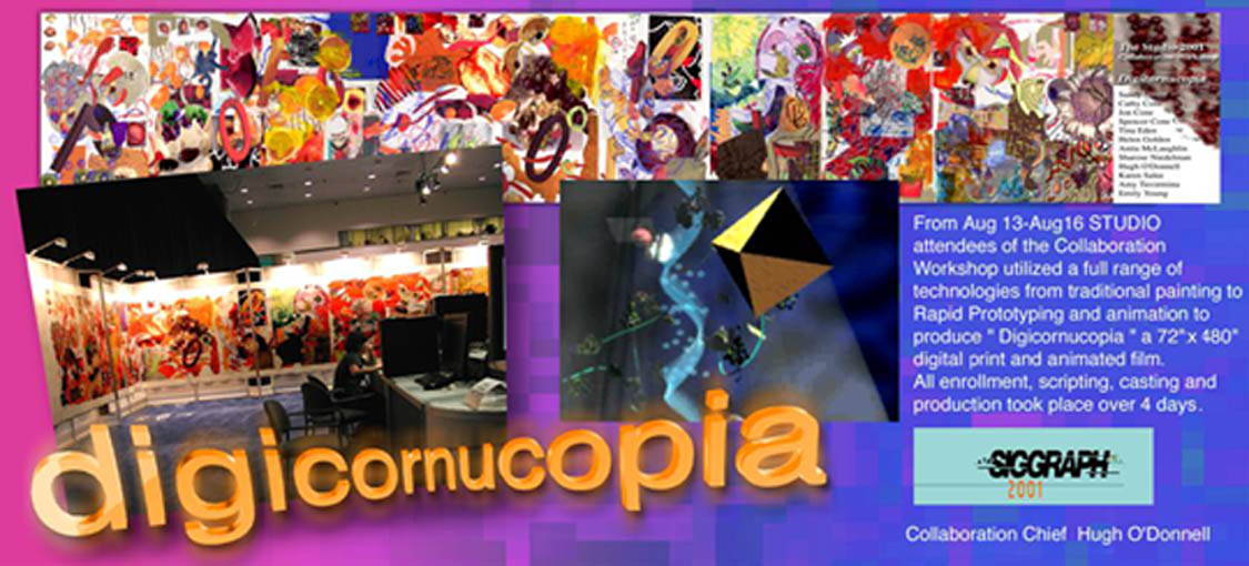 As Collaboration Chief I set up an area where people could create art using either traditional art materials or visualization software. To enable participants to gain a more collaborative, immersive and intensive experience, I decided to use a workshop model based on my Growing Things Workshop. In Growing Things participants draw from fruit and vegetables and create large scale works on paper. I decided to call the workshop Digicornucopia.
