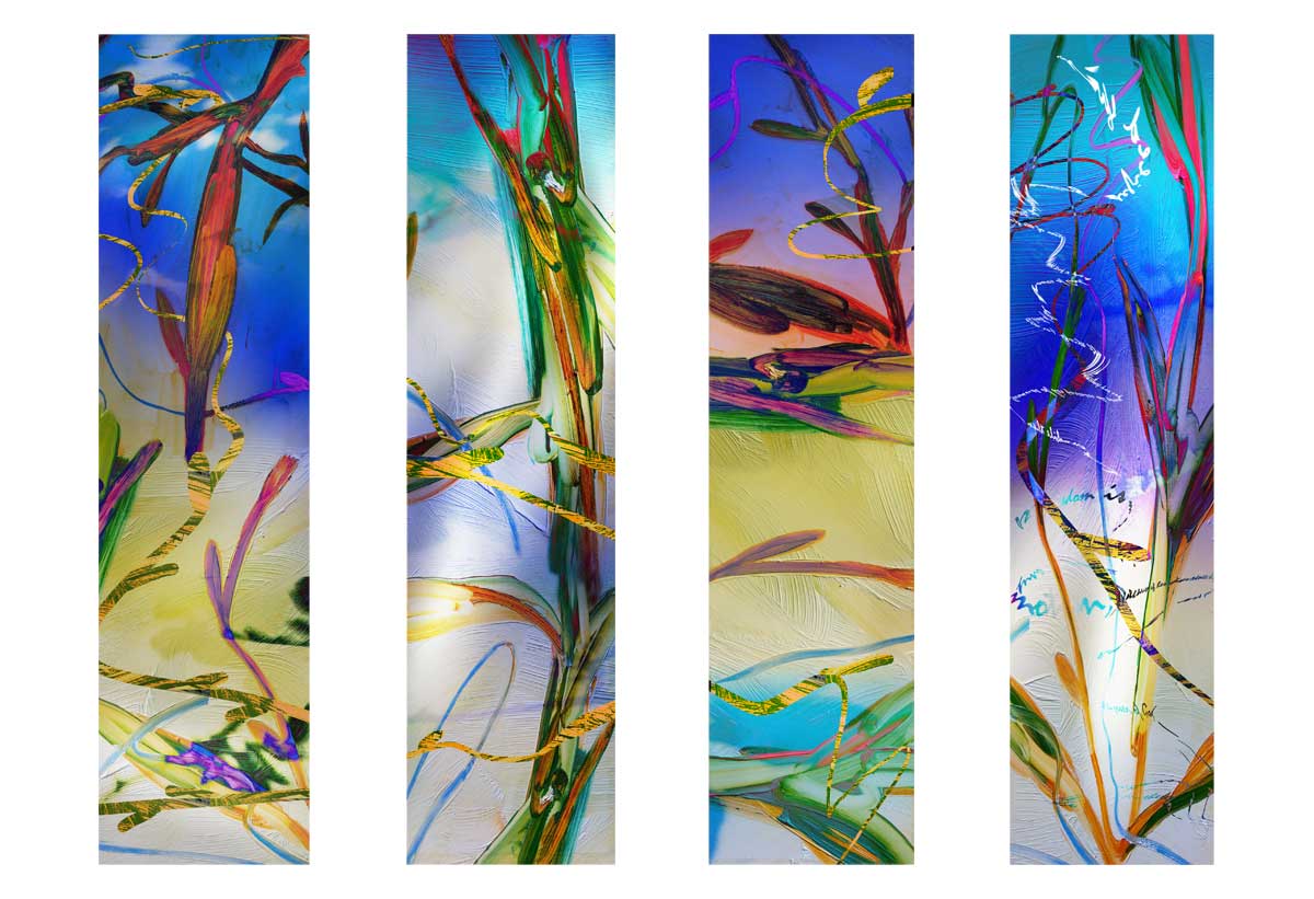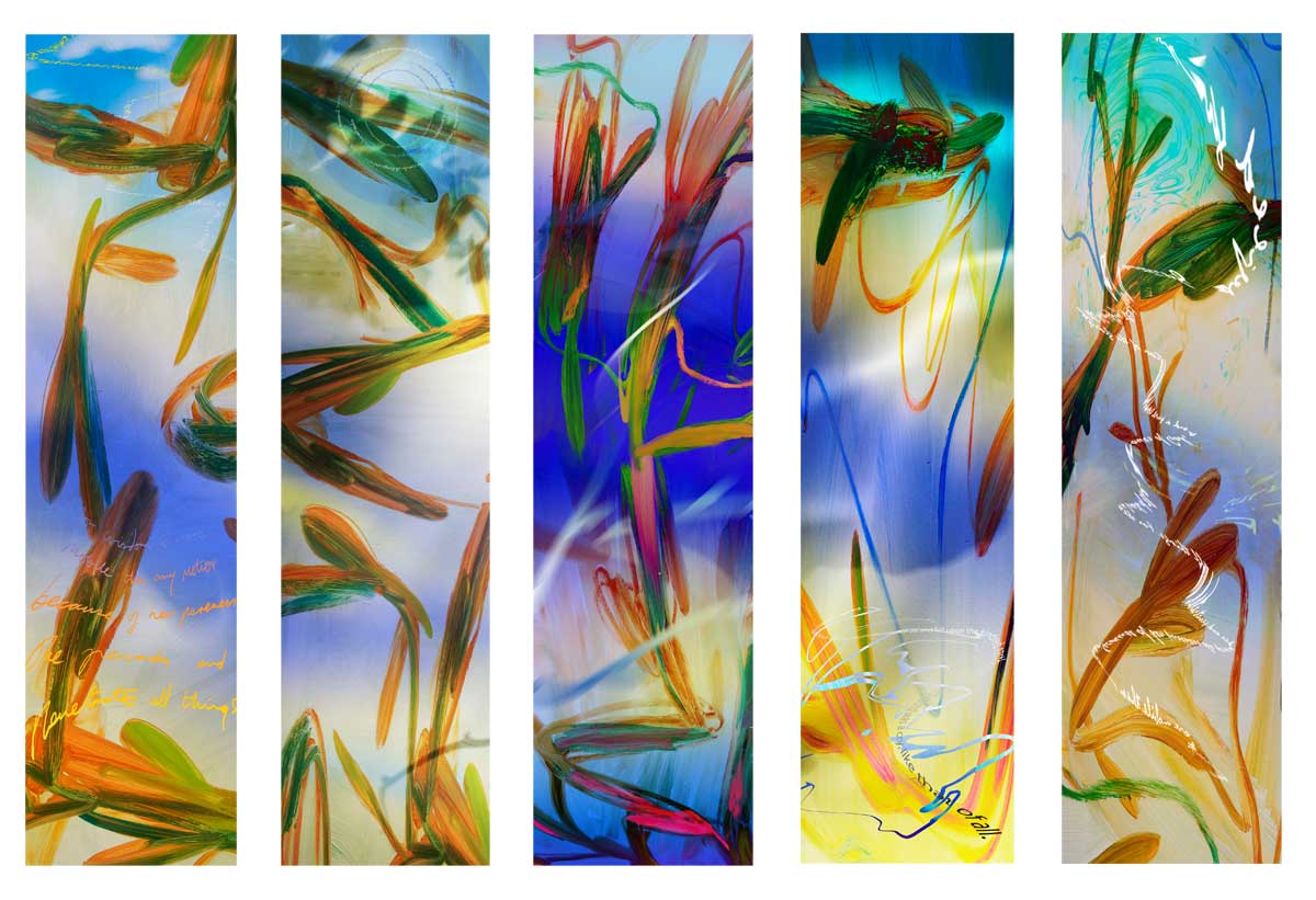 In the Garden of Sophia (West), 2007, Laminated prints produced on canvas and with digital media. The prints are annealed in insulated safety glass. Each of the nine window panels is 166 x 43 inches and is divided into four horizontal mullions. The technique used here is an innovative process of permanently joining the digital prints with glass into a light fast alternative to stained glass. This is the first of its kind in the United States. The windows are installed in the Wisdom House Chapel, Litchfield, Connecticut.